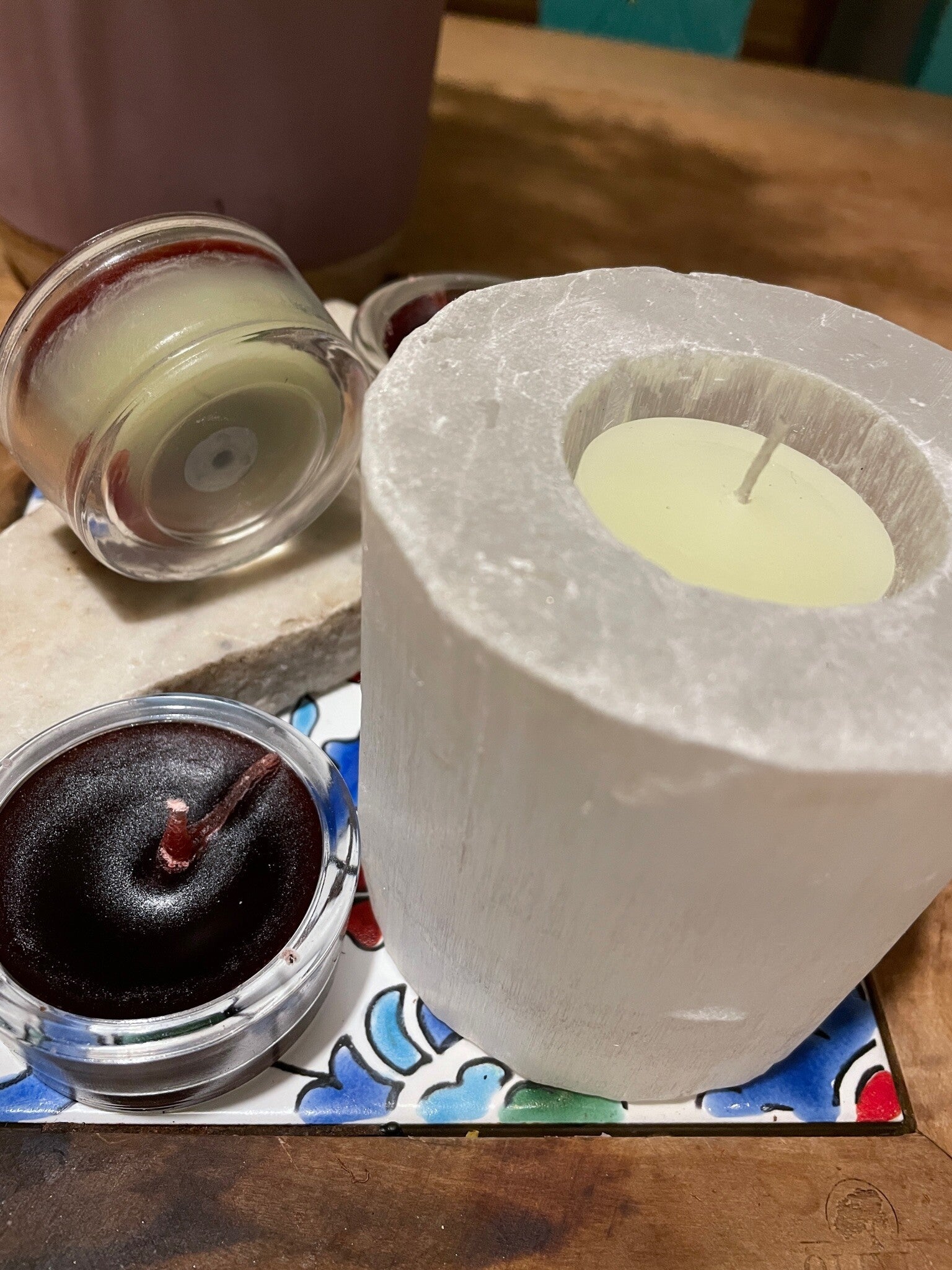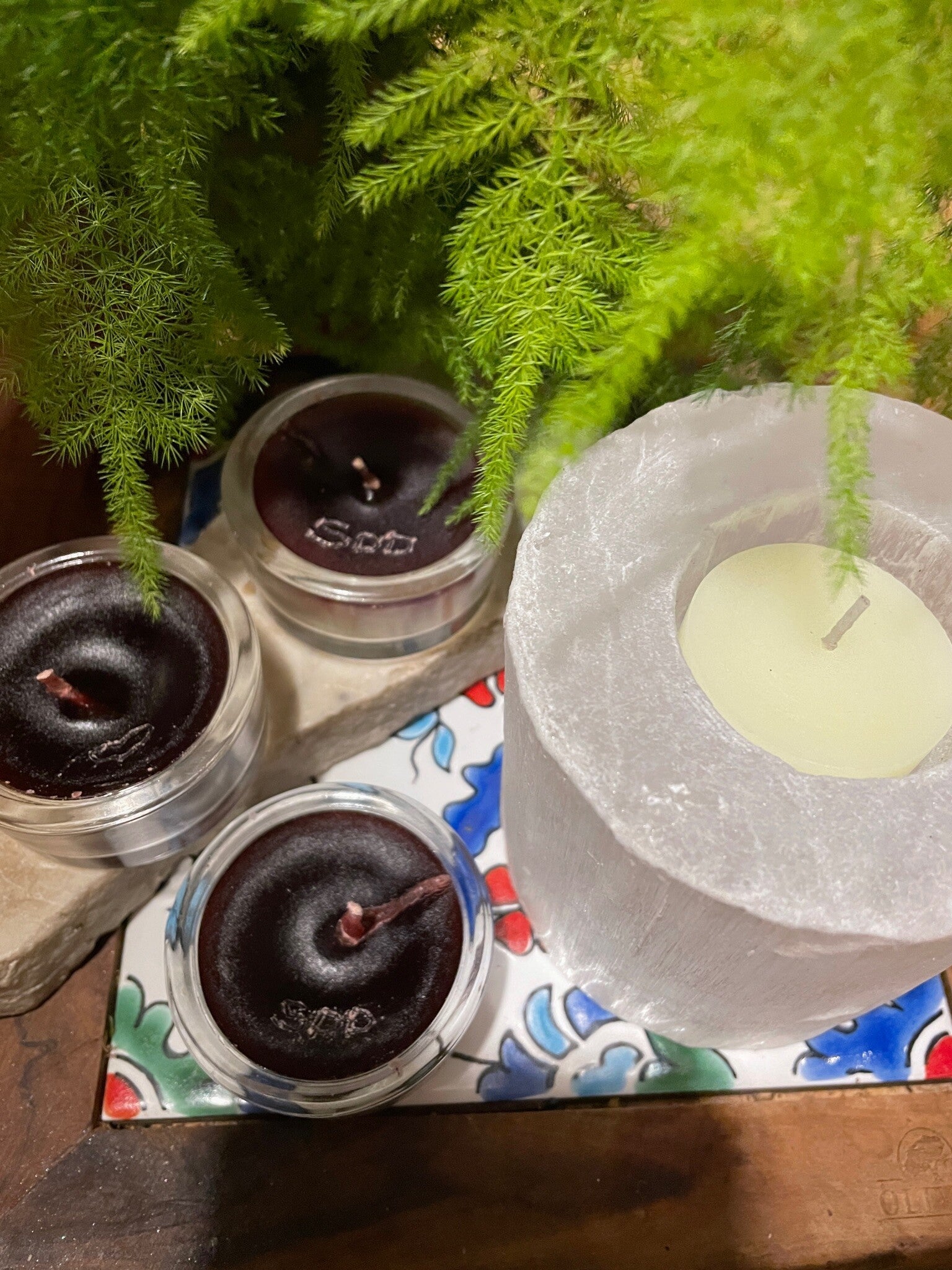 The candle holder is included in the price. Made of stone. Tealights reused wax (pink grepefruit, lime and Indian style colouring)
